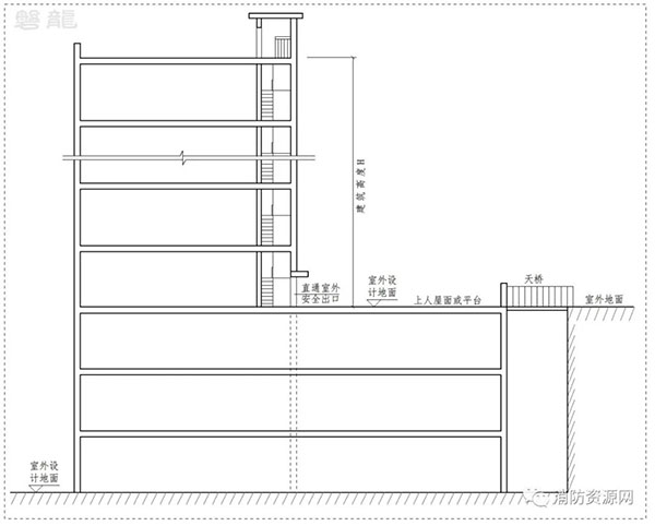 1.1 上人屋面或平台与地面直接连通,或通过天桥直达地面(图示3):