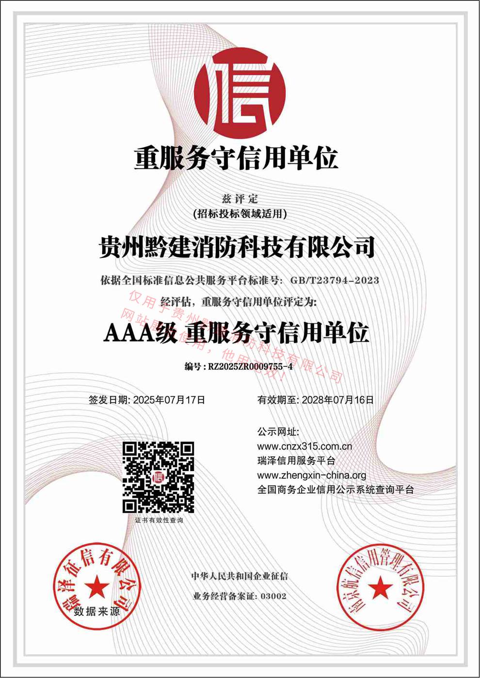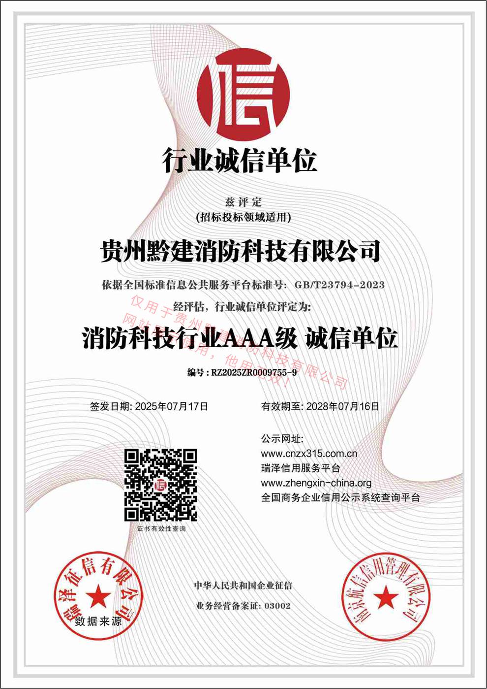 消防科技行业AAA级 诚信单位